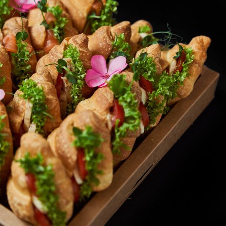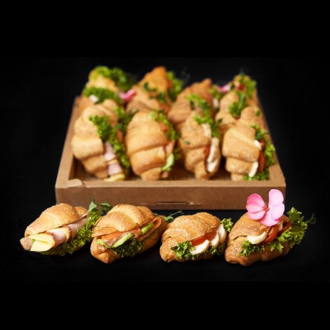 - Міні круасан з курячим філе, сирним мусом, помідором, соусом Цезар та зеленню