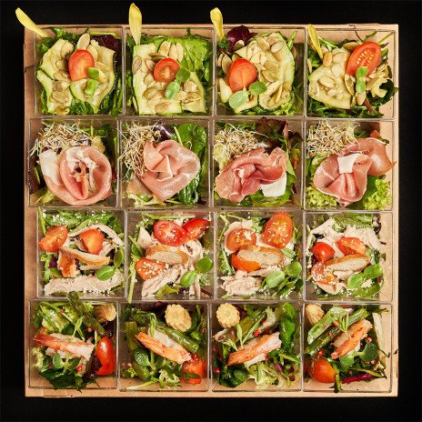 - Салат з креветкою на грилі, спаржою, бебі кукурудзою, помідором чері, зеленню та солодко-гострим соусом