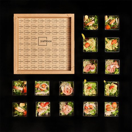 - Салат з філе курки, сиром пармезан, помідором чері, зеленню та соусом Цезарь