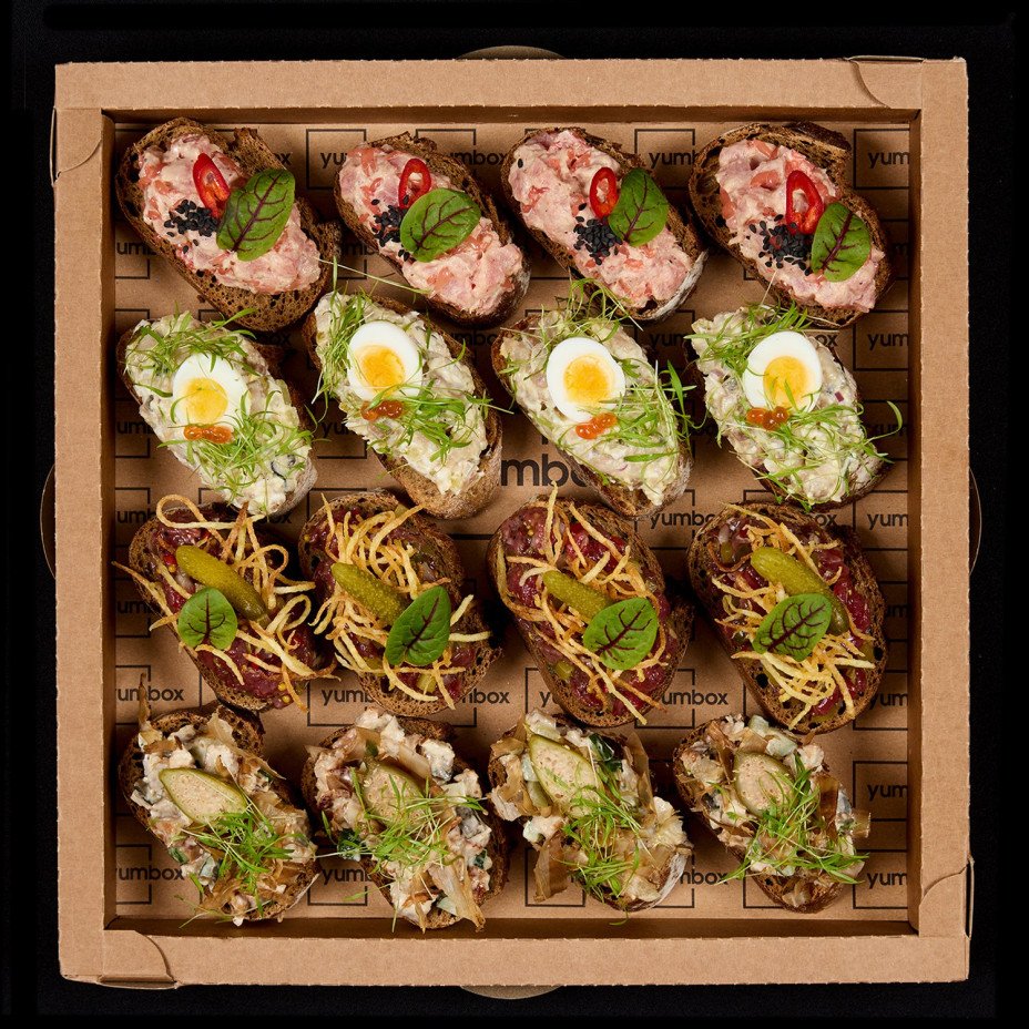 - Канапка з тартаром з оселедця, яйце, мариновані огірок та червона цибуля