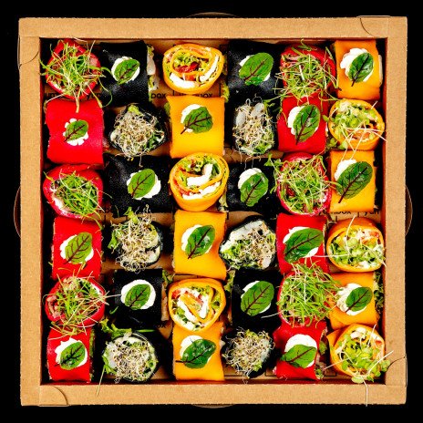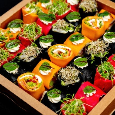Млинці з чорнилом каракатиці,креветками,сирним мусом та міксом салату